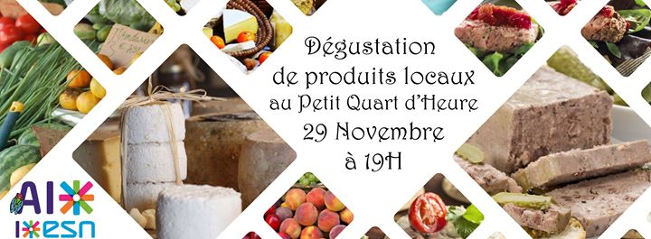 Chers étudiants internationaux et étrangers, le mardi 29 novembre, l’association ESN Aix-en-Provence organise une dégustation de produits du terroir afin de vous faire découvrir une partie des habitudes locales et de la gastronomie française.