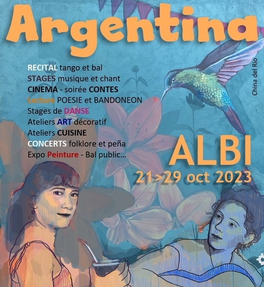Au programe sur Albi : Entre folklore, musique et danse, cette flânerie culturelle, ouverte à tous, va emmener le public au Frigo, (24 oct), pour une soirée poétique avec Solange Bazely (voix) et Marcelo Mercadante (bandoneon). Au centre social de Cantepau (25 oct) qui accueille une session contes et musique, suivie du concert du trio Arena. Puis, à la salle Arcé (26 oct) avec la projection de deux films argentins mais aussi à la salle événementielle de Pratgraussals (27 oct) avec un duo guitare et voix avec Sandra Luna et Vidal Rojas suivi du DJ Carlos Rodriguez qui animera une millonga endiablée ! Enfin, toujours à Pratgraussals, (28 oct), place au folklore argentin avec deux concerts: le duo Sullivan d'Attelis, guitare et charango (Buenos Aires) et le trio Aculla (Barcelone), suivis d'une peña pour danser, partager et s'imprégner des rythmes traditionnels argentins.