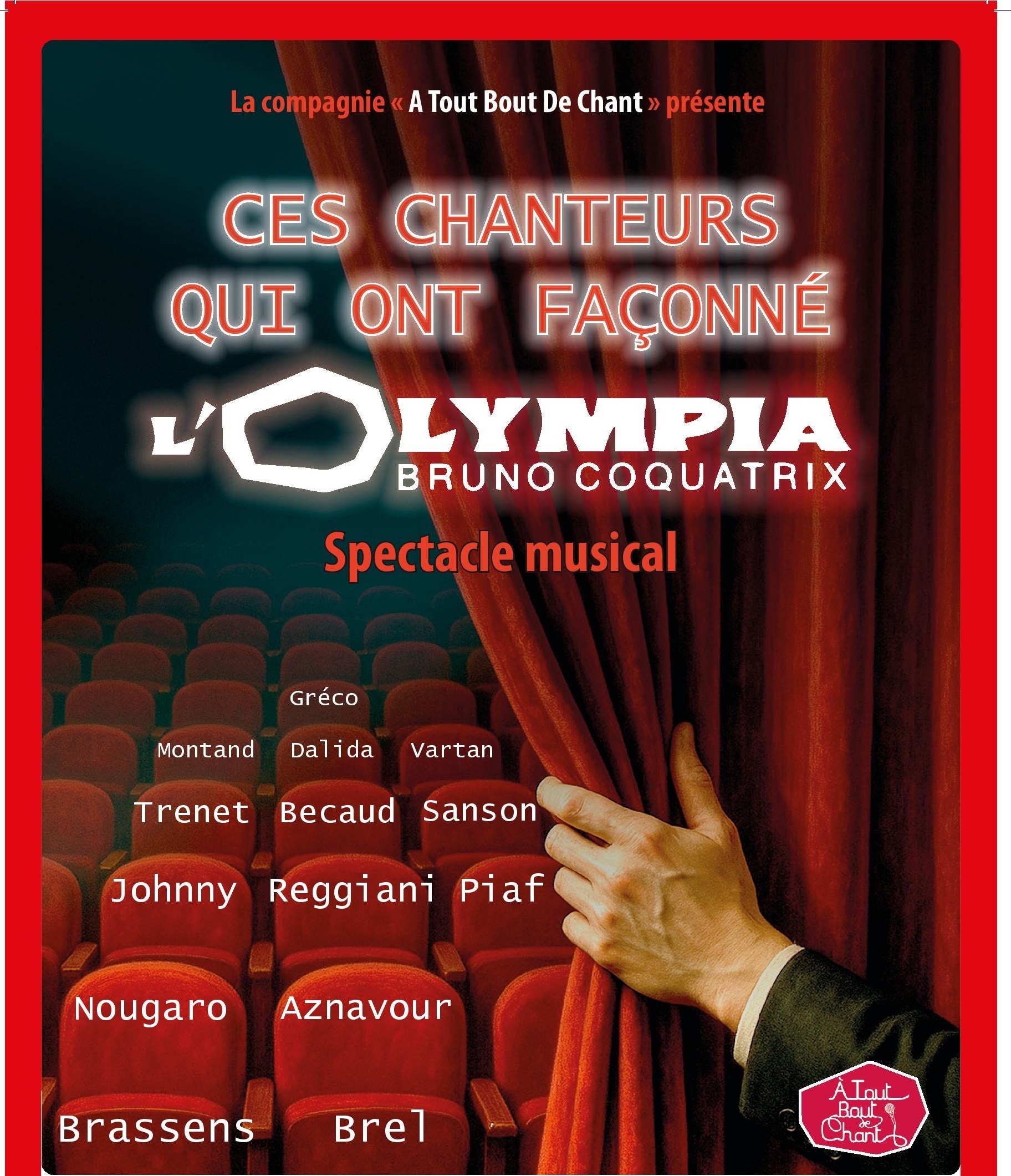 Vous allez assister à un spectacle musical théâtralisé qui rend hommage aux artistes légendaires qui ont marqué l’Olympia de paris sous l’ère de Coquatrix. Piaf, Brel, Barbara, Trenet, Bécaud, Aznavour, Gréco, Johnny et tant d’autres grands talents feront partie du voyage. Avec humour, tendresse et poésie les artistes, conduits par Olivier Nunge, vont nous raconter plus d’un siècle d’histoire musicale ; le tout illustré en direct par 24 chansons emblématiques. On vous attend nombreux pour savourer cette belle histoire !