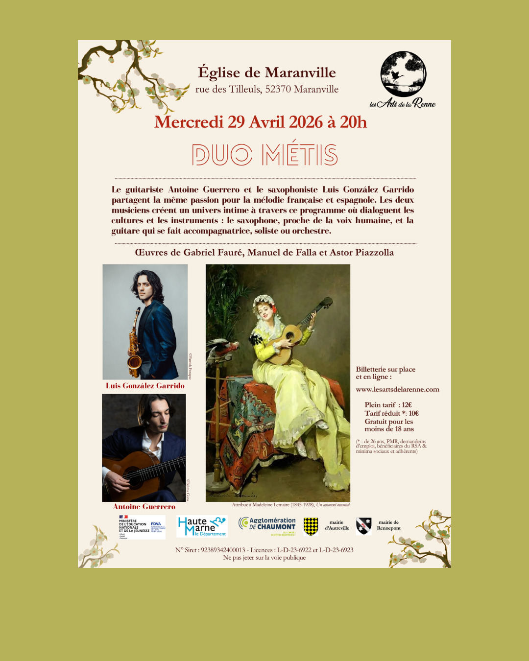 plein tarif 12 euros, tarif réduit 10 euros, gratuit pour les moins de 18 ans