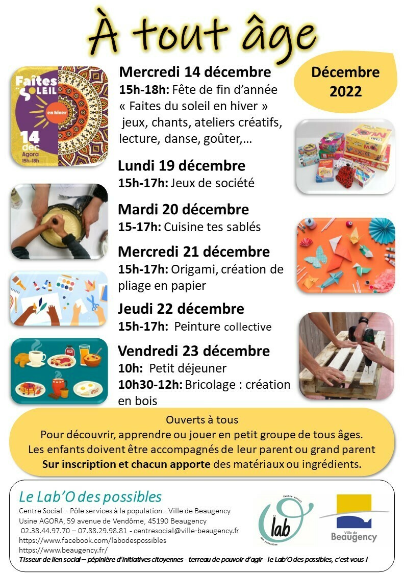 La fête de Léon se réinvente et devient la « Faîtes du soleil en hiver » ! Les valeurs restent les mêmes : une fête collaborative, créée et animée par les habitants et les associations balgentiennes, le tout orchestré par le Lab’O des possibles, Centre social de la ville dans un esprit de partage, et de faire ensemble. Une multitude d’activités créatives, gustatives, auditives et bien d’autres, vous seront proposées durant cette demie journée d’animations. Une fête zéro déchet, 100% récup, bonne humeur et convivialité ! Ouvert à tous : chacun peut contribuer en apportant un élément de décor ou un gâteau , … vous pouvez aussi contribuer : prochaine réunion le 8 decembre à 10h00 ou en nous contactant!