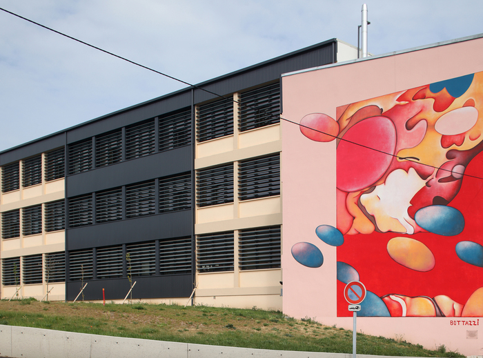 Cette œuvre en mouvement et haute en couleurs mesure 13 mètres de haut. Elle a été réalisée par Guillaume Bottazzi en 2011 sur un bâtiment protégé, inscrit au patrimoine industriel. Elle a été financée par le Ministère de la Culture et par la Région Auvergne-Rhône-Alpes et marque l’entrée de la communauté d’agglomération de Clermont-Ferrand.