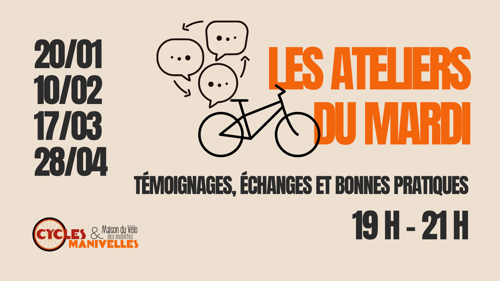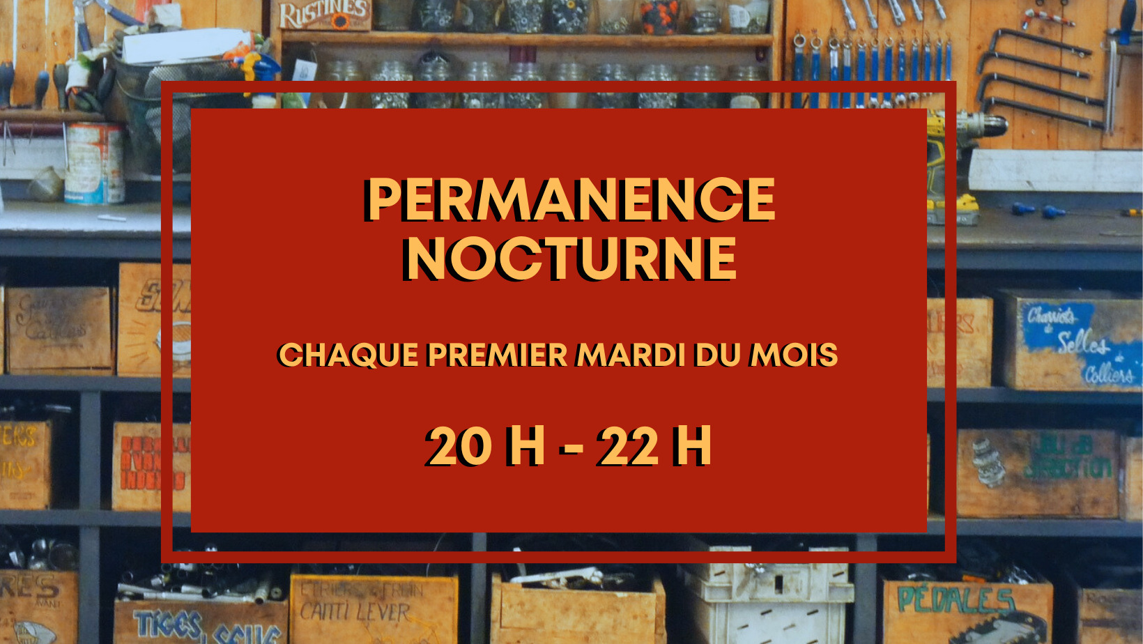 Un mercredi par mois de 17h à 19h c'est mission réemploi ! on alterne entre démontage, on récupère les pièces sur de vieux vélos pour (ré)alimenter les stocks et remontage, si tu veux apprendre la mécanique, à te servir des outils, aider l'asso et venir trinquer, papoter entre adhérent.e.s c'est l'occasion !