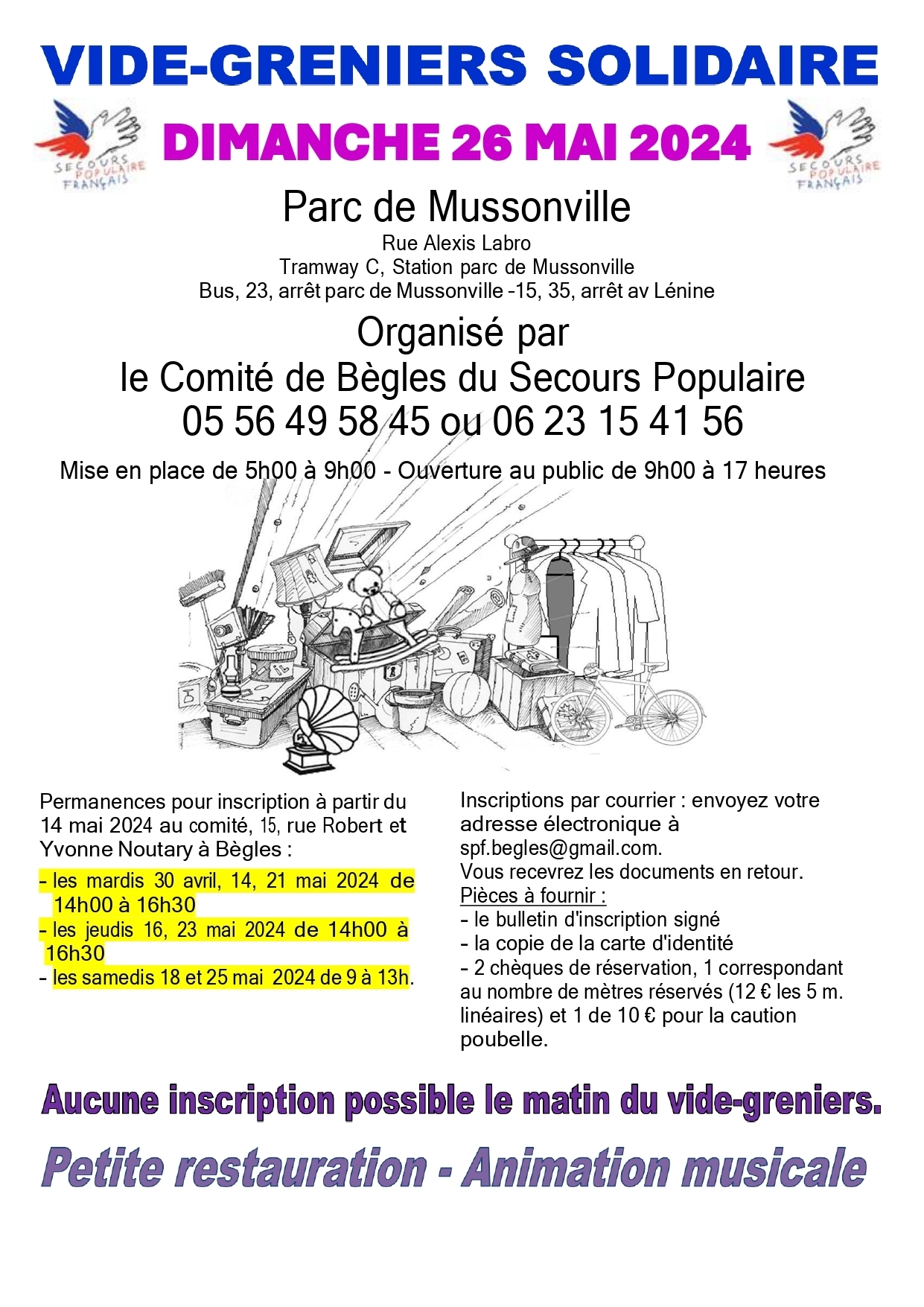 Aucune inscription le matin du vide greniers Renseignements et inscription : 05 56 49 58 45 ou 06 23 15 41 56 [email protected]