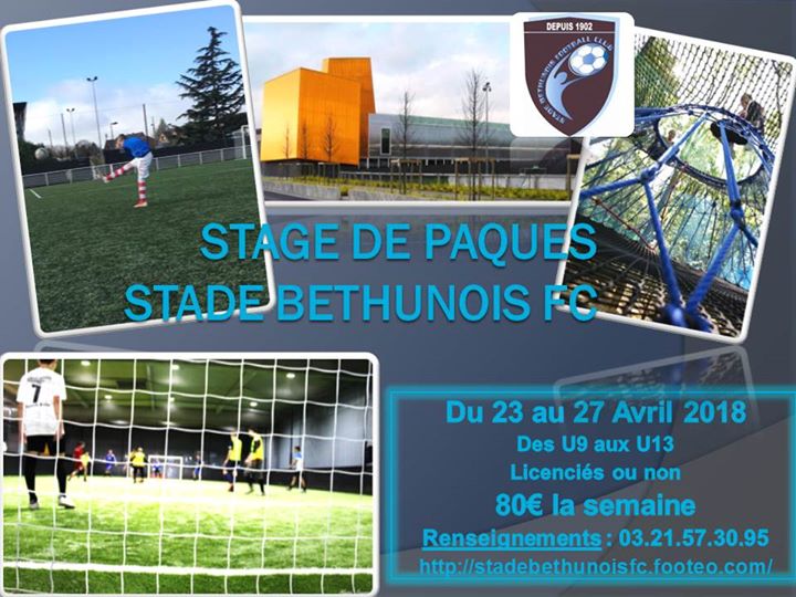 Le Stade Béthunois Football Club organise son traditionnel stage de Pâques pendant la 1ère semaine des vacances d’Avril, du lundi 23 au vendredi 27 Avril 2018.