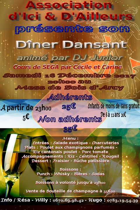 L'Association d'Ici & d'Ailleurs présente son dîner dansant qui aura lieu au Mess de Bois d'Arcy à partir de 20h00 le samedi 16 décembre 2017. Avec le talentueux Dj Junior, et des cours de Séga offert par les talentueuse danseuse Cécile et Carine. Venez nombreux et nombreuses. Nous vous attendons pour passer une merveilleuse soirée dans la joie et la festivité pour clôturer cette année 2017. Toutes informations/réservations disponible en MP ou bien via Willy et Hugo joignable par téléphone.