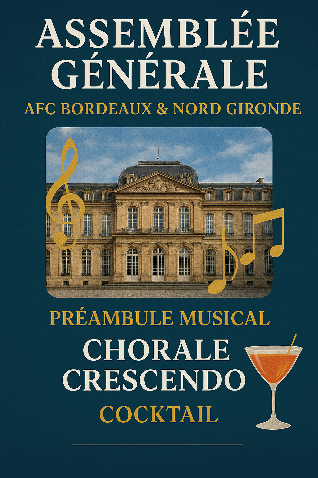 L’Assemblée Générale de l’AFC Bordeaux & Nord Gironde est bien plus qu’une réunion statutaire : c’est une soirée VIP exceptionnelle, où se mêlent institution, culture et convivialité. Dans le cadre prestigieux du Palais Rohan, avec la musique de Crescendo et un cocktail raffiné, les adhérents vivront une expérience mémorable, symbole de l’esprit fédérateur et dynamique de l’association.