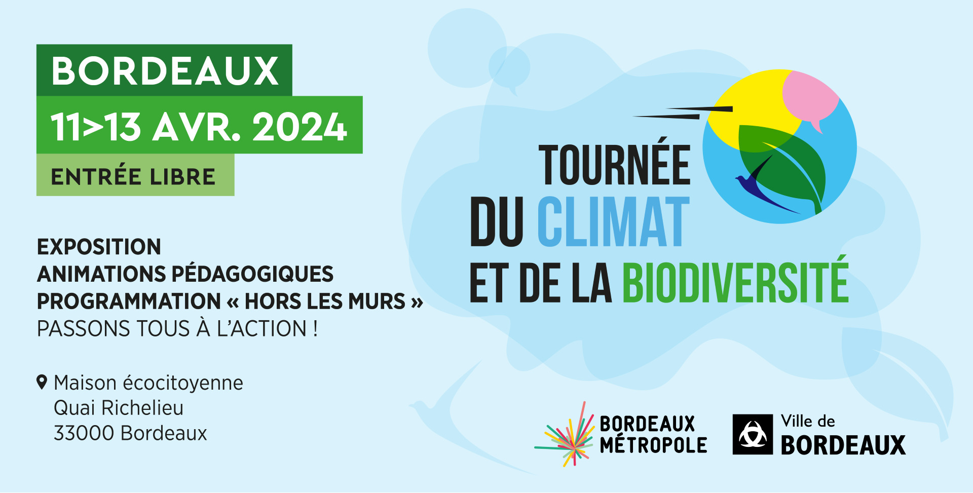 Le caractère innovant de cette exposition vient du fait que les enjeux climat et biodiversité y sont abordés conjointement. Elle a été réalisée en partenariat avec le Muséum national d’Histoire naturelle. Via sa programmation d'animations, le projet souhaite encourager toutes les générations à se mettre en action autour de solutions concrètes. Exposition scientifique L’exposition s’installe pendant trois jours à Bordeaux : entièrement gratuite, il est possible de la visiter seul, en famille ou entre amis. Conçue par des scientifiques, elle aborde à la fois les enjeux climat et biodiversité. Les enseignants peuvent réserver un créneau de visite pour leur classe du CM1 à la terminale. Les autres visiteurs peuvent entrer librement. Durant 1h, un scientifique vous guide pour rendre accessibles l’ensemble des concepts et répondre à vos questions. Tout au long du parcours, des jeux et manipulations permettent d’apprendre en s’amusant et en prenant part au débat. Programmation « hors les murs » à Bordeaux: Découvrez également notre programmation d’animations « hors les murs » avec des acteurs locaux de la mobilisation. Elles vous aideront à passer à l’action : personne ne doit rester seul face à ces défis. Ciné-débat, performance artistique, conférence, fresque, atelier de cuisine coopérative, balade des initiatives de quartier : chacun trouvera son format. En savoir plus sur www.tourneeclimatbiodiversite.fr