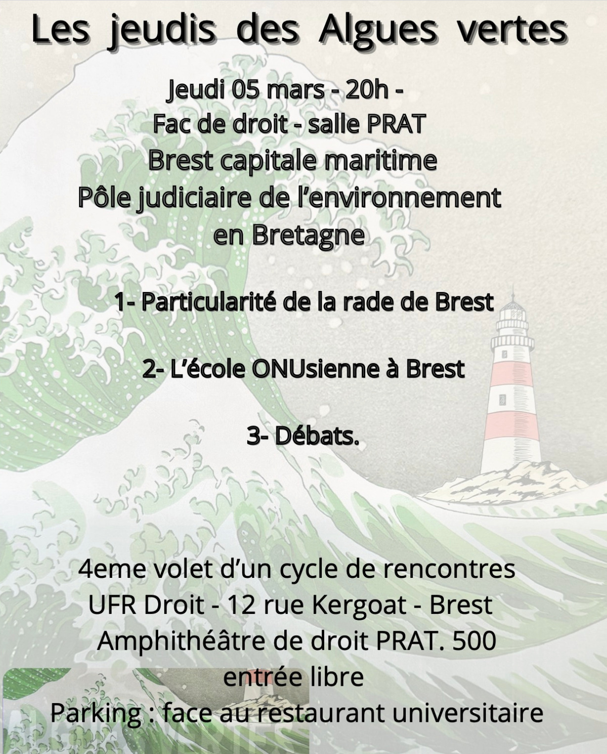 Dans le cadre des jeudis des algues vertes les candidat( e)s aux élections municipales sont invité(e)s jeudi 5 mars à 20 h à la faculté de droit de l'UBO à présenter leur programme pour en finir avec cette pollution tragique qui touche toute la Bretagne et à débattre ensemble.
