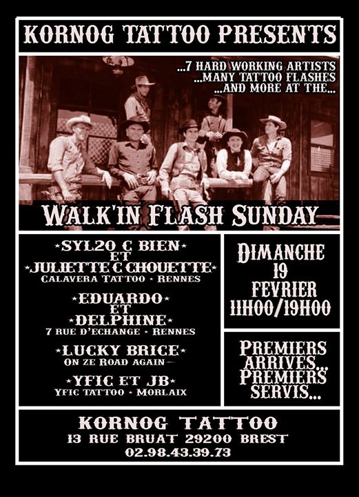 7 tatoueurs vous proposent chacun une planche de motifs en tout genre crée pour l'occasion; seuls ces flashs seront tatoués ce jour là.