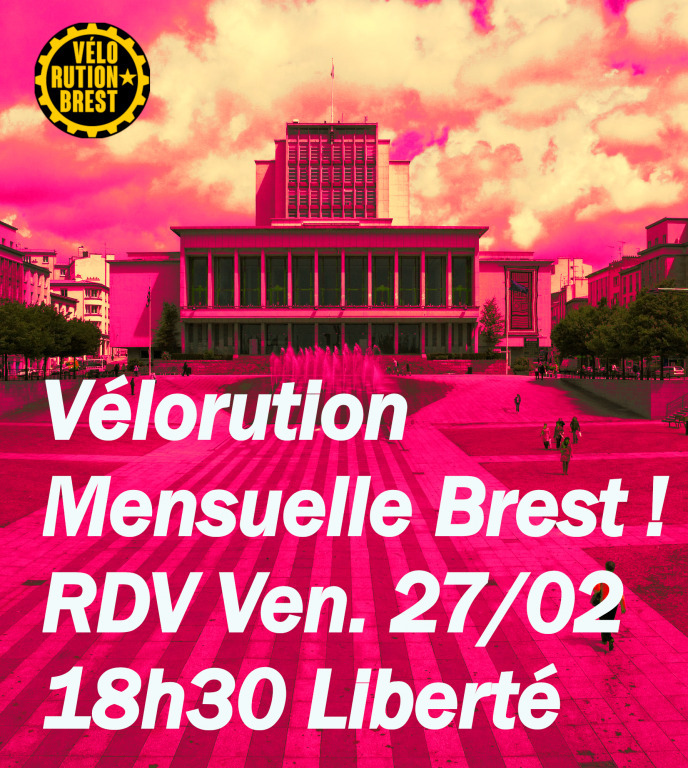 La Vélorution de Février 2026 passera par Liberté, St Michel, Place de Strasbourg pour terminer en bas des marches du bar Perruche bas de Siam avant le pont de Recouvrance. L'occasion de passer un moment convivial ensemble autour d'un verre.
