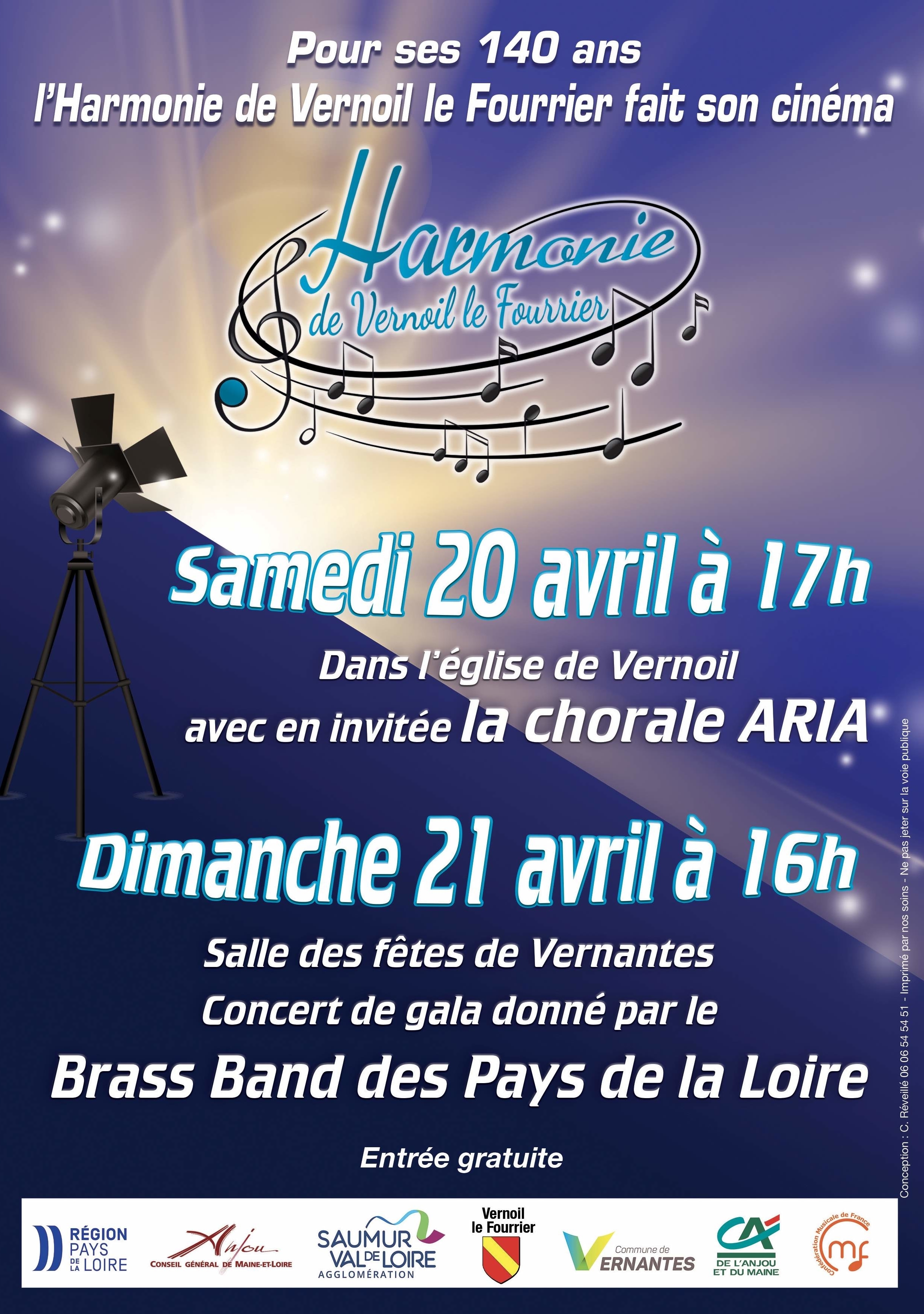 En 2024, l’Harmonie de Vernoil Le Fourrier fête ses 140 ans avec le thème des musiques de films. Après avoir invité l’Orchestre d’Harmonie de la Ville d’Angers le 17 mars, elle vous propose 2 concerts le samedi 20 avril et le dimanche 21 avril. Le 20 avril, dans l’église de Vernoil à 17h, première partie avec l’Harmonie de Vernoil Le Fourrier dirigée par Frédéric Chicoisne, en deuxième partie, la Chorale ARIA dirigée par Paul Robert et en troisième partie, les 2 ensembles réunis. Entrée gratuite, pas de réservations.