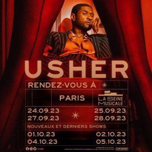 Organisateur : SAS STS EVENEMENTS LA SUPERSTAR MONDIALE USHER, RECOMPENSÉE PAR DE MUTLIPLES GRAMMY, ANNONCE RENDEZ-VOUS À PARIS, UNE SERIE DE SHOWS EXCLUSIFS À LA SEINE MUSICALE Après plus de 50 concerts à guichets fermés à Las Vegas, la superstar mondiale Usher, huit fois récompensée aux GRAMMY Awards, a annoncé une nouvelle série concerts, exclusifs en Europe, à La Seine Musicale de Paris. Débutant le 24 septembre 2023, Rendez-Vous à Paris présentera des tubes tels que Yeah ! , My Boo , Love In This Club et bien d'autres encore, issus des 30 ans de carrière d'Usher. Les fans assisteront à un spectacle aux costumes inédits, avec des éclairages et des effets spéciaux à la pointe de la technologie. La série de concerts organisée à La Seine Musicale et pendant la Fashion Week, sera l'unique occasion d'assister à ce show exclusif et très prisé d'Usher, dans toute l'Europe. Rendez-Vous Á Paris à La Seine Musicale: 24 septembre 25 septembre 27 septembre 28 septembre