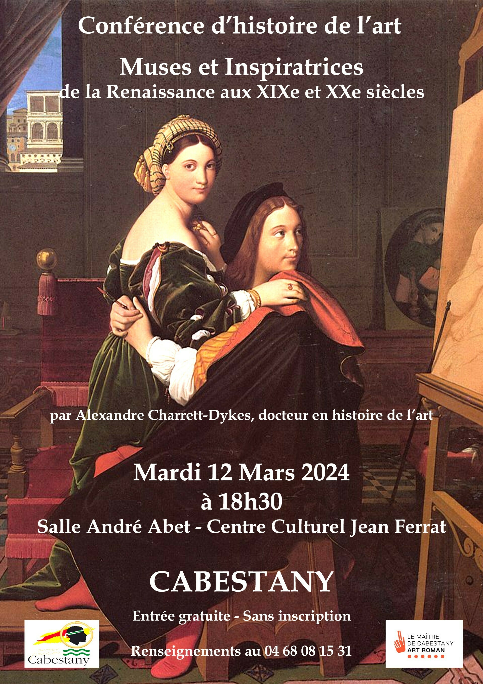 Conférence gratuite "Les muses et inspiratrices d'artistes" (fin XIX -début XX ème siècle) animée par Alexandre Charrett-Dykes. Lieu : salle Abet du Centre Culturel Jean Ferrat. Sans inscription.