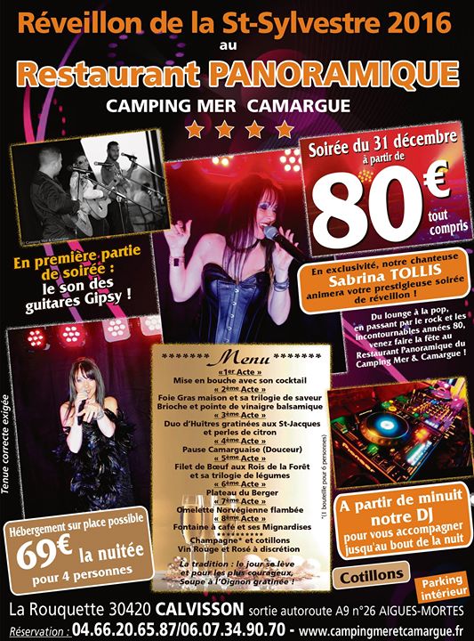 Soirée exceptionnelle pour se reveillon 2016 au restaurant panoramique du camping Mer et Camargue. Depuis plus de 4 années un vrai succés. Alors n'hésitez plus réservations au 06 07 34 90 70. Hébergement sur place possible pour profiter encore plus de votre soirée.