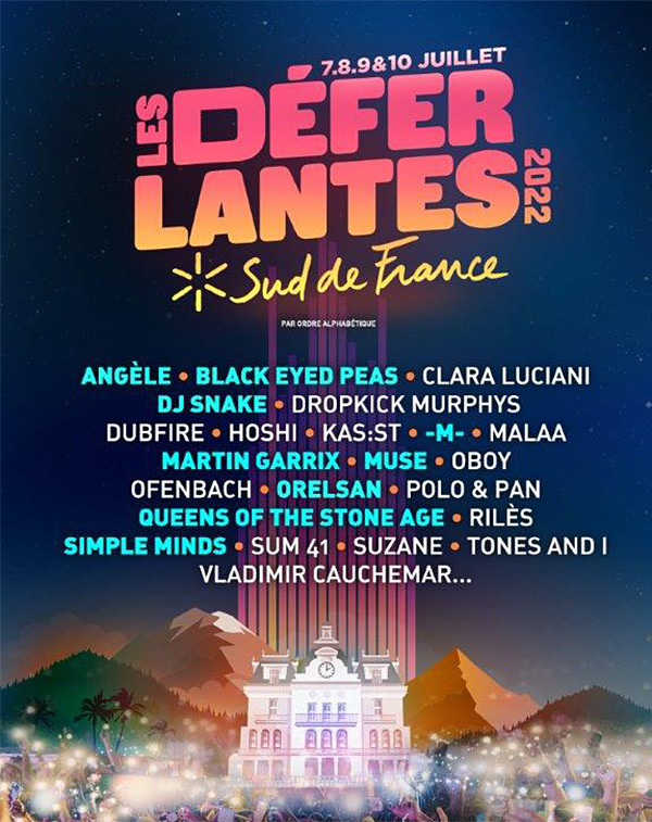 Du 7 au 10 juillet 2022 Château d'Aubiry - Céret Les Déferlantes Sud de France au château d'Aubiry, le début d'une nouvelle histoire. Cette nouvelle édition sera l'occasion de fêter nos 15 ans et d'inaugurer un nouveau cycle de développement au château d'Aubiry. Plus d'espace pour le public et nos partenaires. Plus de scènes pour amplifier encore la diversité musicale. Plus de bars et de food trucks pour déguster les produits de notre Territoire. Une grande roue et de nouvelles animations. Une promenade au coeur d'un parc arboré de dix hectares d'arbres centenaires. Et enfin un camping pour faciliter l'accueil de ceux qui souhaitent partager le festival au plus près. Cette multiplicité de nouveautés, nous l'attendions et sommes très heureux de la proposer. Maintenant en mesure de répondre à l'attente du public toujours plus avide de nouveautés, d'artistes toujours plus prestigieux, les Déferlantes Sud de France pourront dorénavant accueillir au Château d'Aubiry, à Céret dans le Vallespir, une programmation musicale encore jamais proposée sur notre Territoire. Programmation (par ordre alphabétique) : ANGELE / CLARA LUCIANI / DJ SNAKE / DROPKICK MURPHYS / DUBFIRE / HOSHI KAS :ST /-M- / MALAA / MARTIN GARRIX / MUSE / OBOY / OFENBACH / ORELSAN POLO & PAN / QUEENS OF THE STONE AGE / RILÈS / SIMPLE MINDS / SUM 41 SUZANE / TONES AND I / VLADIMIR CAUCHEMAR