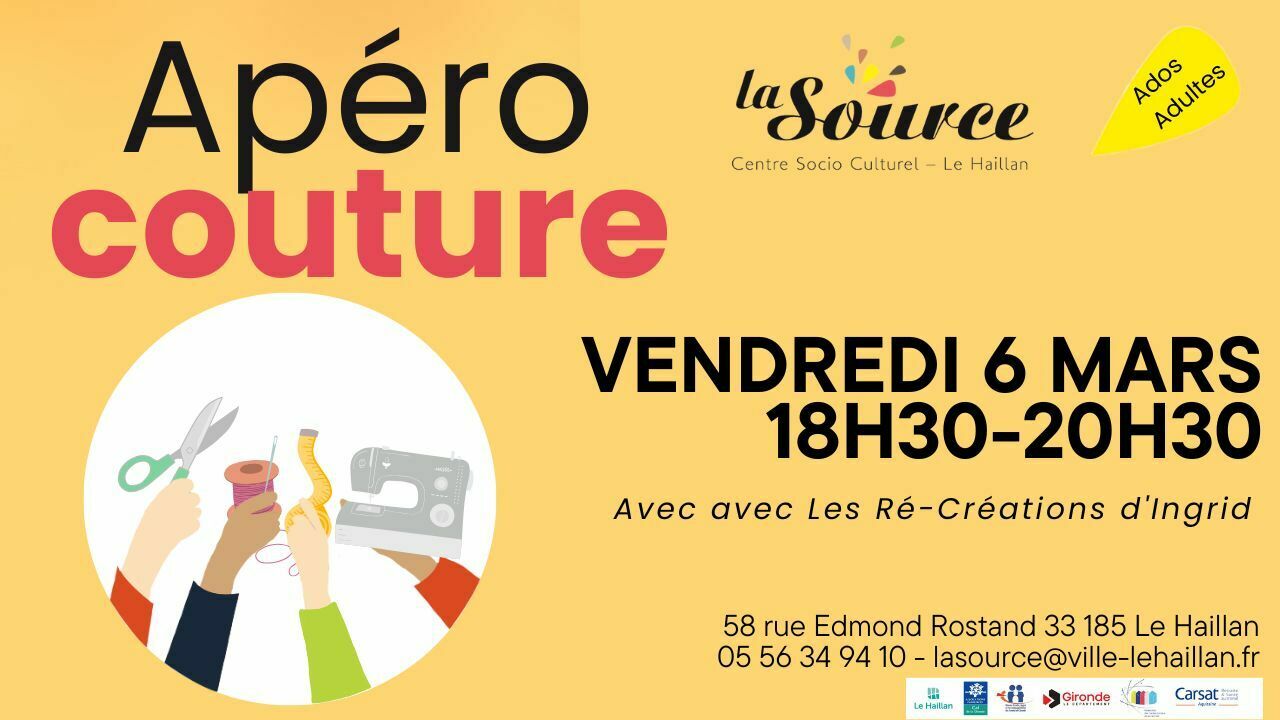 7€/ atelier + adhésion annuelle à La Source https://www.helloasso.com/associations/centre-socio-culturel-la-source/evenements/apero-couture-mars