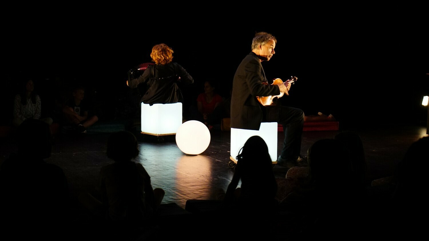 Partir du silence, donner à entendre les sources imagées du son acoustique, donner à voir les prémices de la lumière, quand les musiciens s’installent dans une forme de concert, de la pénombre à l’éclairage, dans un cheminement progressif, au milieu des enfants, tranquilles puis joyeux. Réagir, interagir avec leurs émotions : en exploiter le chemin à l’aide d’une forme mélodique, prélude à une douce naissance harmonique, menant à un concert riche et festif. Enfin, les petits seront invités à toucher, à jouer, à danser…