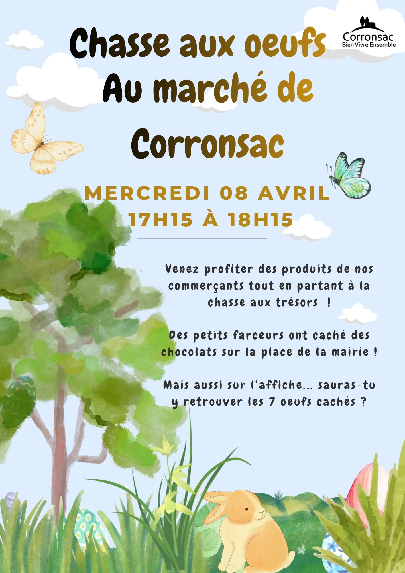 L’association « Corronsac bien vivre ensemble » annonce une chasse aux œufs, ce mercredi 8 avril, sur le marché, de 17 h 15 à 18 h 15. Une belle occasion aussi de flâner parmi les stands et de profiter des produits des commerçants !