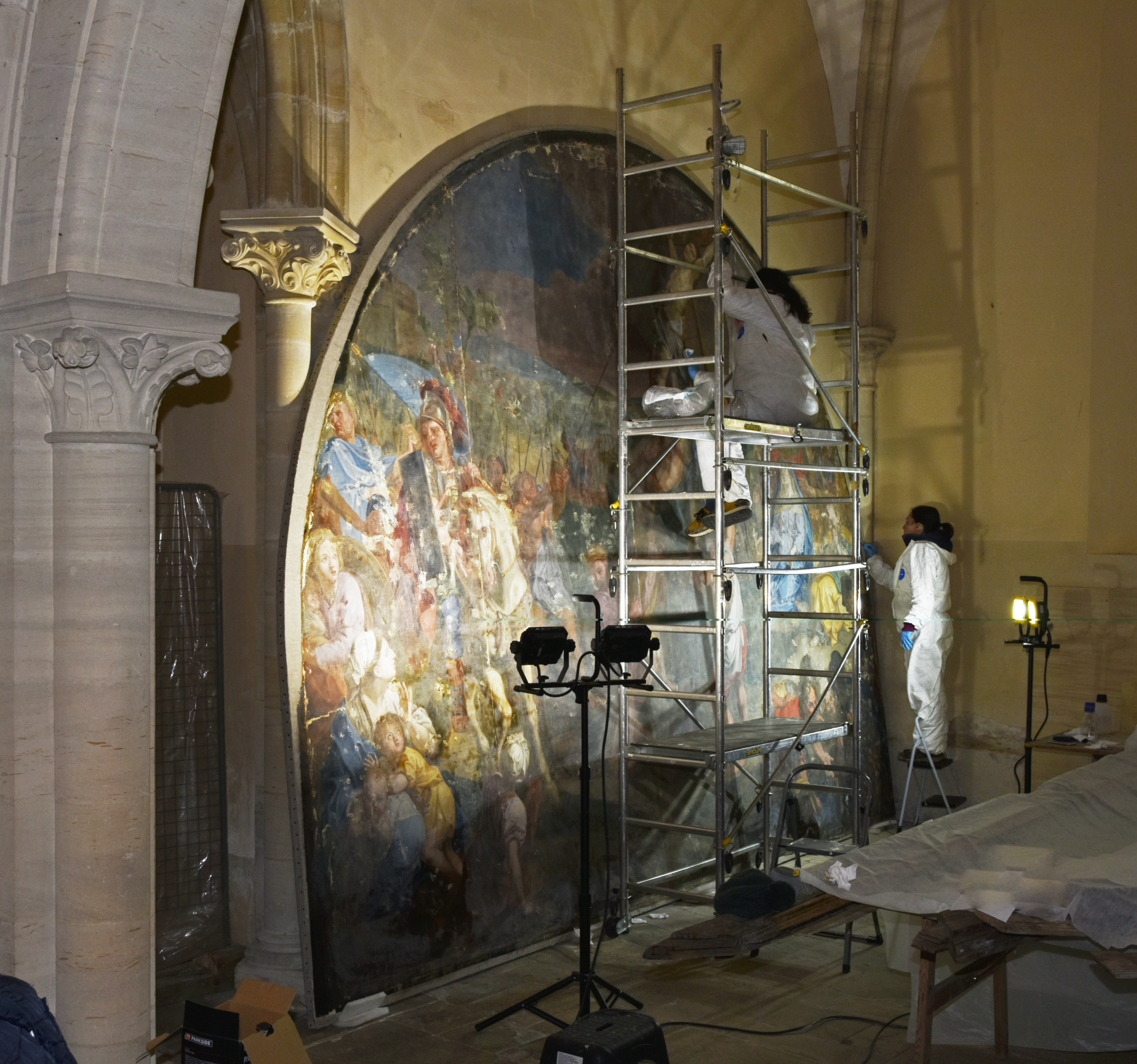 Visite-promenade commentée de la restauration réalisée en 2023 du tableau du XVIIIe siècle classé MH L'Elévation de la Croix qui a retrouvé son emplacement d'origine dans le choeur de l'église.
