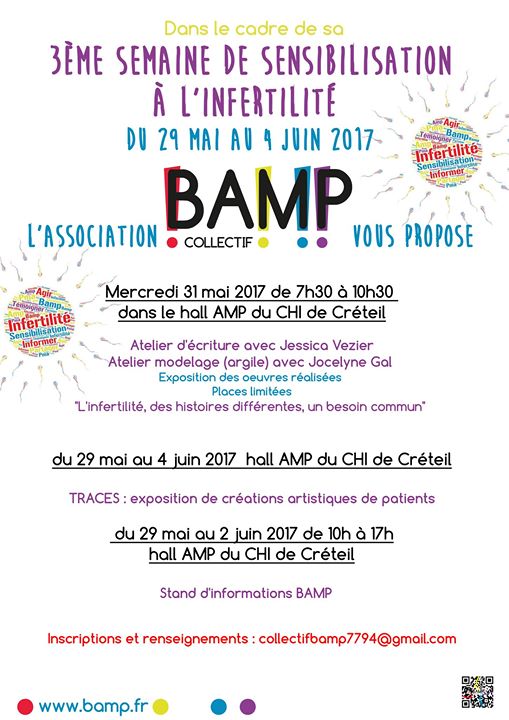 Voici un rendez-vous supplémentaire pendant cette 3ème Semaine de Sensibilisation à l’Infertilité, en banlieue parisienne, dans le Val de Marne. Jessica, référente BAMP vous propose plusieurs rendez-vous au Centre Hospitalier Intercommunal de Créteil.