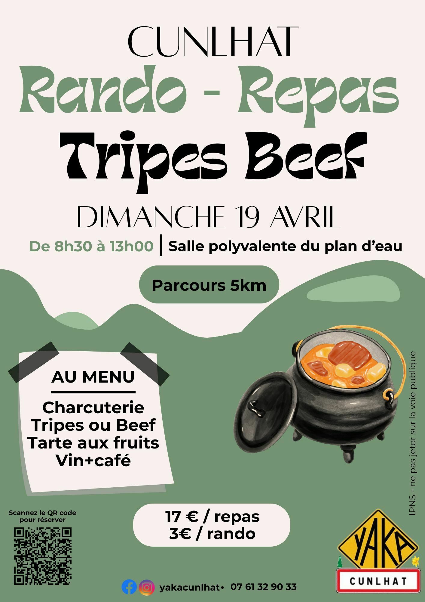 Réservez idéalement via le lien HelloAsso. Gratuit pour les moins de 10 ans. 3€ : rando seule. 17€ : repas seul