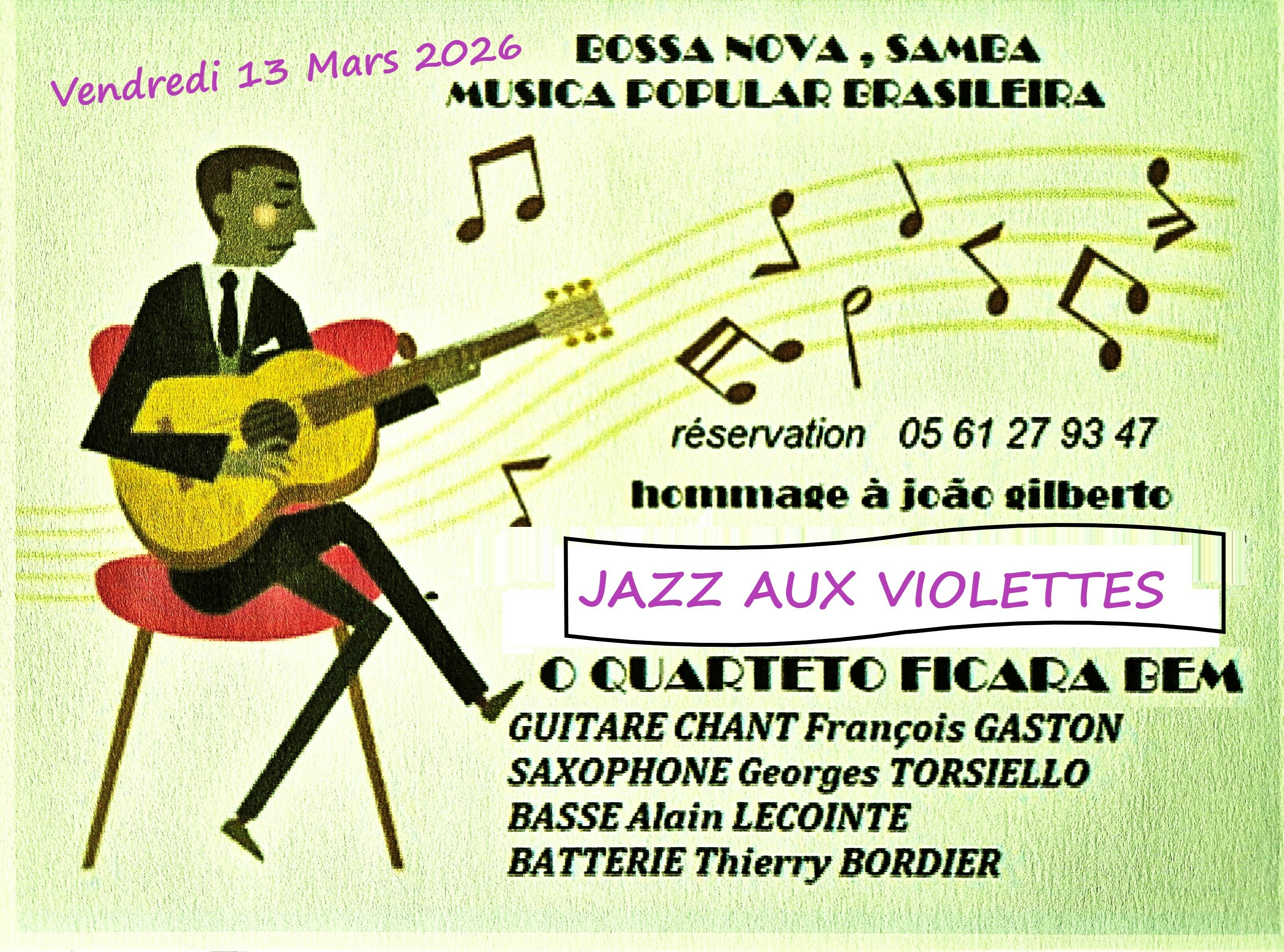 Dans le cadre de Jazz Aux Violettes, ce merveilleux quatuor interprètera un répertoire festif et varié de Bossa Nova, de Samba et musique populaire Brésilienne pour notre plus grand plaisir.