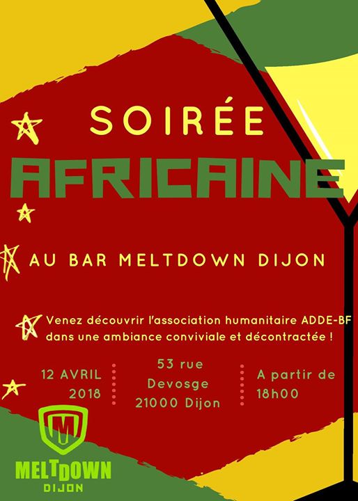 L’association ADDE-BF organise une soirée africaine au Meltown bar à Dijon. Venez-découvrir l’association et le bar dans une ambiance conviviale et décontractée.