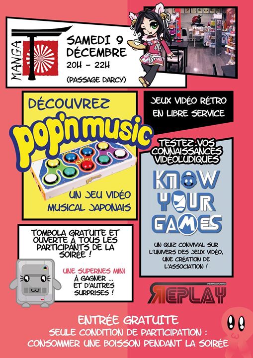 Venez nombreux le samedi 09 décembre prochain, de 20h à 22h, afin d'avoir un libre accès aux nombreux spots de jeux vidéos retro japonais que REPLAY nous propose de découvrir!
