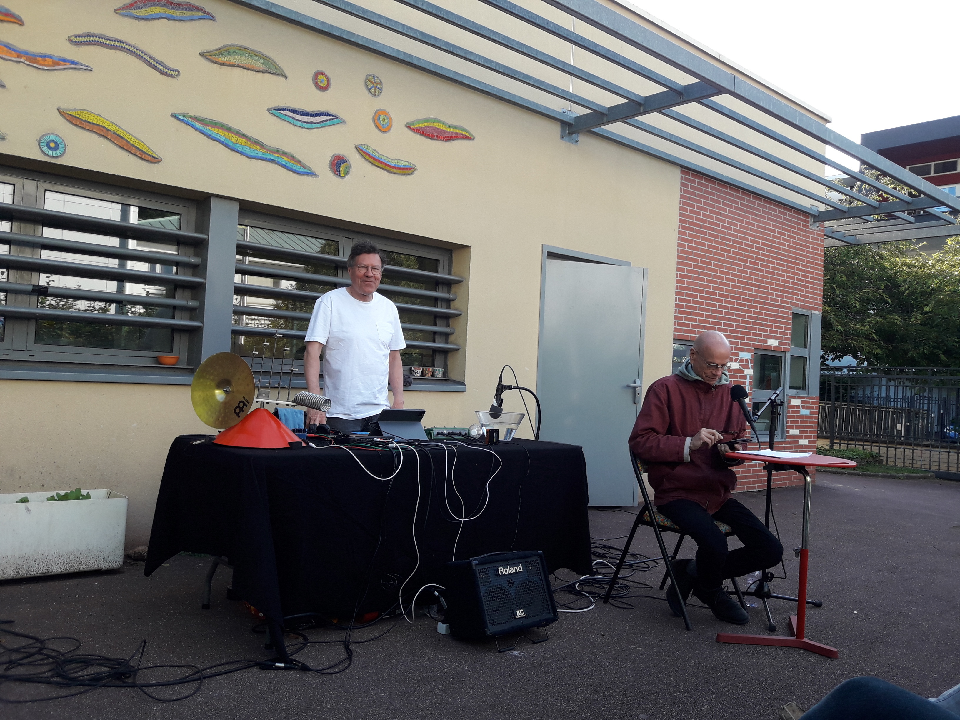 Au milieu d'une scénographie d'objets amplifiés et de projections dessinées en temps réel et reliées aux sons, elle permet d’exprimer un lien, une rencontre, entre l’artiste et son environnement.