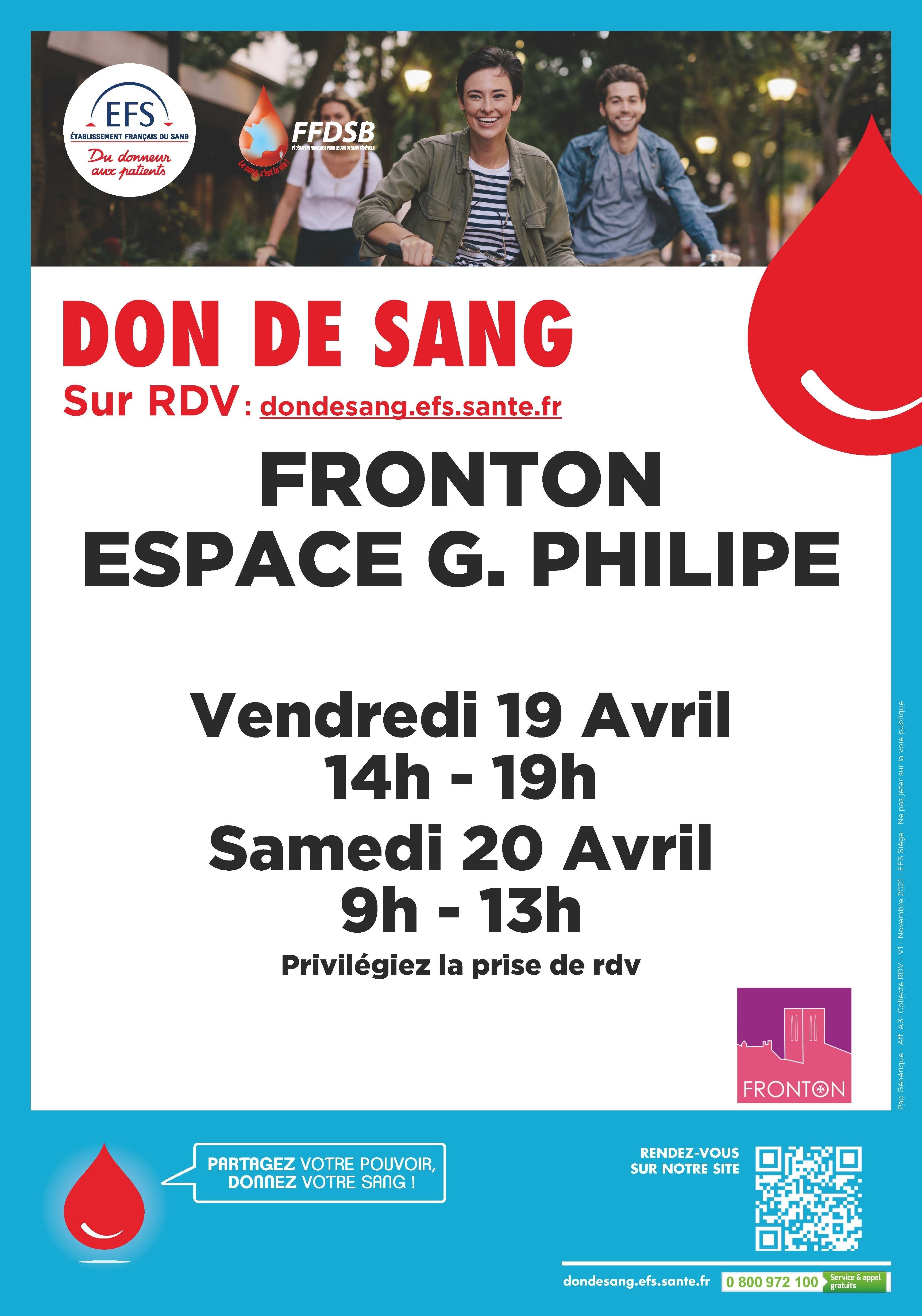Prochaine Collecte à Fronton les 19 & 20 Avril 2024 A l'espace Gérard Philipe Réserver un créneau ici !