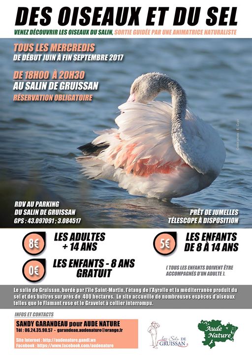 De juin à septembre, retrouvez nous tous les mercredis à 18h00 au Le Salin de Gruissan pour une visite guidée au travers de ce site encore en activité. Muni de paires de jumelles et d'un télescope vous pourrez observer en détail de nombreux oiseaux, tout en bénéficiant des explications de votre animatrice naturaliste. En ce moment, stationnent et se reproduisent les Avocettes élégantes et les sternes pierregarins ainsi que les Goélands railleurs. Flamant rose, Bergeronnette printanière et bien d'autres espèces seront également au rendez-vous. Nous vous dirons tout des petits secrets de ces oiseaux. Accessible à tous, on vous attend, seul, entre amis ou en famille. RESERVATION OBLIGATOIRE (0624359057 ou