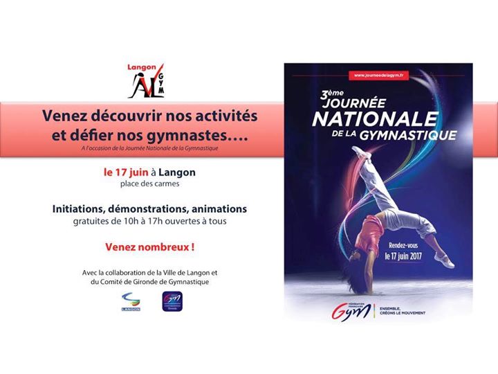 Le 17 juin, c'est la journée nationale de la gym partout en France. La Vaillante de Langon et le Comité de Gironde de Gymnastique vous donnent RDV de 10h à 17h sur la place des carmes de Langon pour assister à des démonstrations et participer à des initiations et des défis en présence des gymnastes du club... Des animations gratuites et ouvertes à tous pour promouvoir notre discipline... Venez nombreux pour défier nos gymnastes ! www.vaillantegymlangon.fr