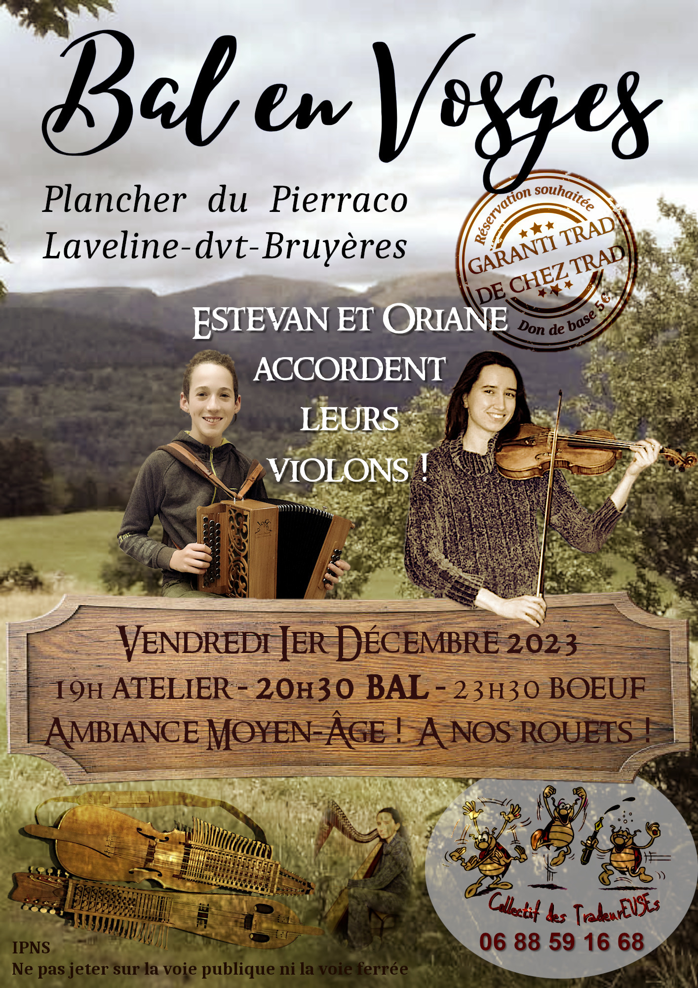 Retrouvons-nous autour de ces deux jeunes prodiges, Estevan à l'accordéon diatonique, Oriane tantôt à la harpe, tantôt au violon. Ces deux-là se donnent la réplique dans un harmonieux tumulte aux accents roumains, gascons, basques, irlandais... et les danseurEUSEs sont aux anges, les pieds en folie, la tête dans les étoiles !