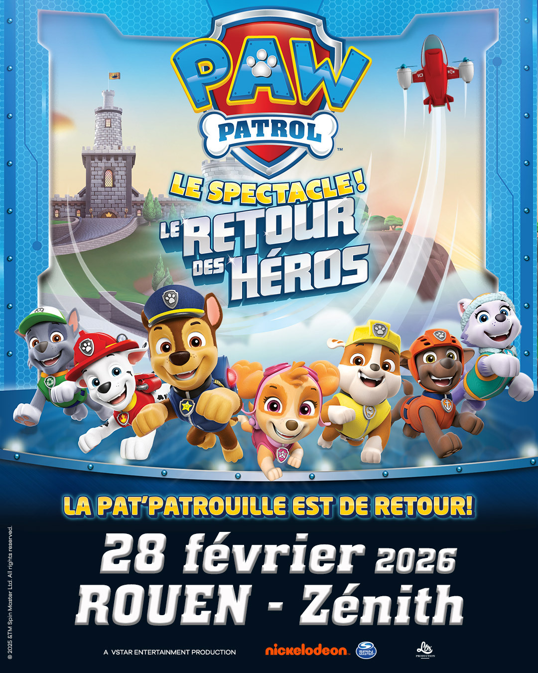 Présenté par Los Production (LR-22-2290/2291). Pat’ Patrouille le spectacle ! « Le Retour des Héros » le tout nouveau spectacle évènement de la Pat’ Patrouille en tournée dans toute la France à partir du 20 décembre 2026 !Plongez dans une aventure interactive où les enfants deviennent de véritables héros aux côtés de leurs chiots préférés. En mission autour du monde pour revenir à Adventure Bay à temps, Ryder et sa brigade canine comptent sur le public pour les aider !Dans « Le Retour des Héros » le maire Hellinger sème la pagaille en clonant Robo Dog ! La Pat’ Patrouille devra rassembler tous les clones, sauver leur ami robot… et prouver qu’en équipe, rien n’est impossible.Ne manquez pas cette aventure inédite de la Pat’ Patrouille — réservez vite vos places pour un moment magique à vivre en famille !Chaque personne doit être munie d'un billet unique pour assister au spectacle.Aucune gratuité enfant, quel que soit l'âge.Tarif Enfant : Enfant moins de 12 ans.