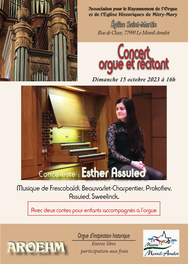 L'AROEHM clôture sa saison de concerts consacrée cette année aux Femmes organistes en accueillant de nouveau Esther Assuied, qui était déjà venue le 14 mai à Mitry pour un mémorable après-midi. Cette fois elle nous proposera un programme qui pour une bonne part sera dédié aux enfants. On ne sait pas assez combien les enfants, sont fascinés par la musique d'orgue, encore faut-il qu'ils en aient l'occasion. Il y a de magnifiques expériences dans le domaine des contes mis en musique, par exemple https://www.florence-rousseau.com/contes-musicaux/ Bref le programme comprendra Frescobaldi, Beauvarlet-Charpentier, Sweelinck, mais aussi une transcription de Pierre et le loup et un Petit Chaperon Rouge de sa composition. Ce choix ne doit pas étonner; en effet si les orgues anciens sont faits pour jouer de la musique ancienne, ils permettent aussi de splendides échappées vers des répertoires plus inattendus: ceux d'entre nous qui étaient là ont encore dans les oreilles le Libertango incendiaire offert le 4 juin sur l’orgue de Mitry par Lidia Ksaszciewicz. Bref une occasion à ne pas manquer pour une visite en famille...