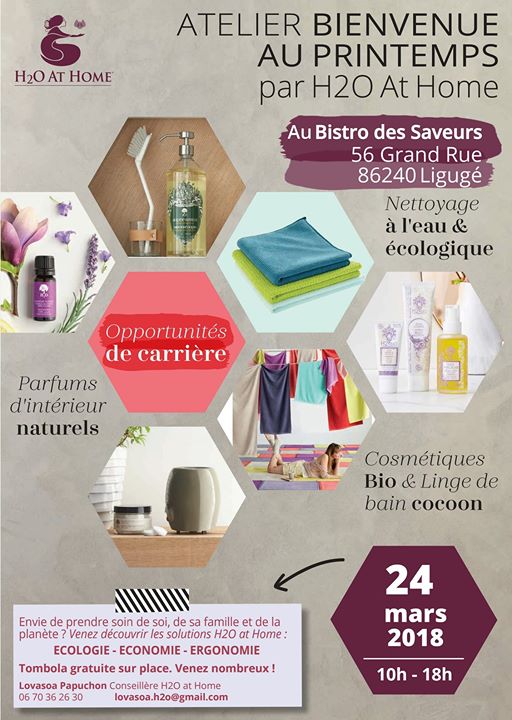 Ce samedi, je vous retrouve au bistro des Saveurs à Ligugé pour vous expliquer notre concept et vous pourrez voir, toucher, sentir nos produits. Il y en a pour la maison mais pas que : arômathérapie, cosmétiques bio et linge de bain toute douce ! Que du beau et du bio !