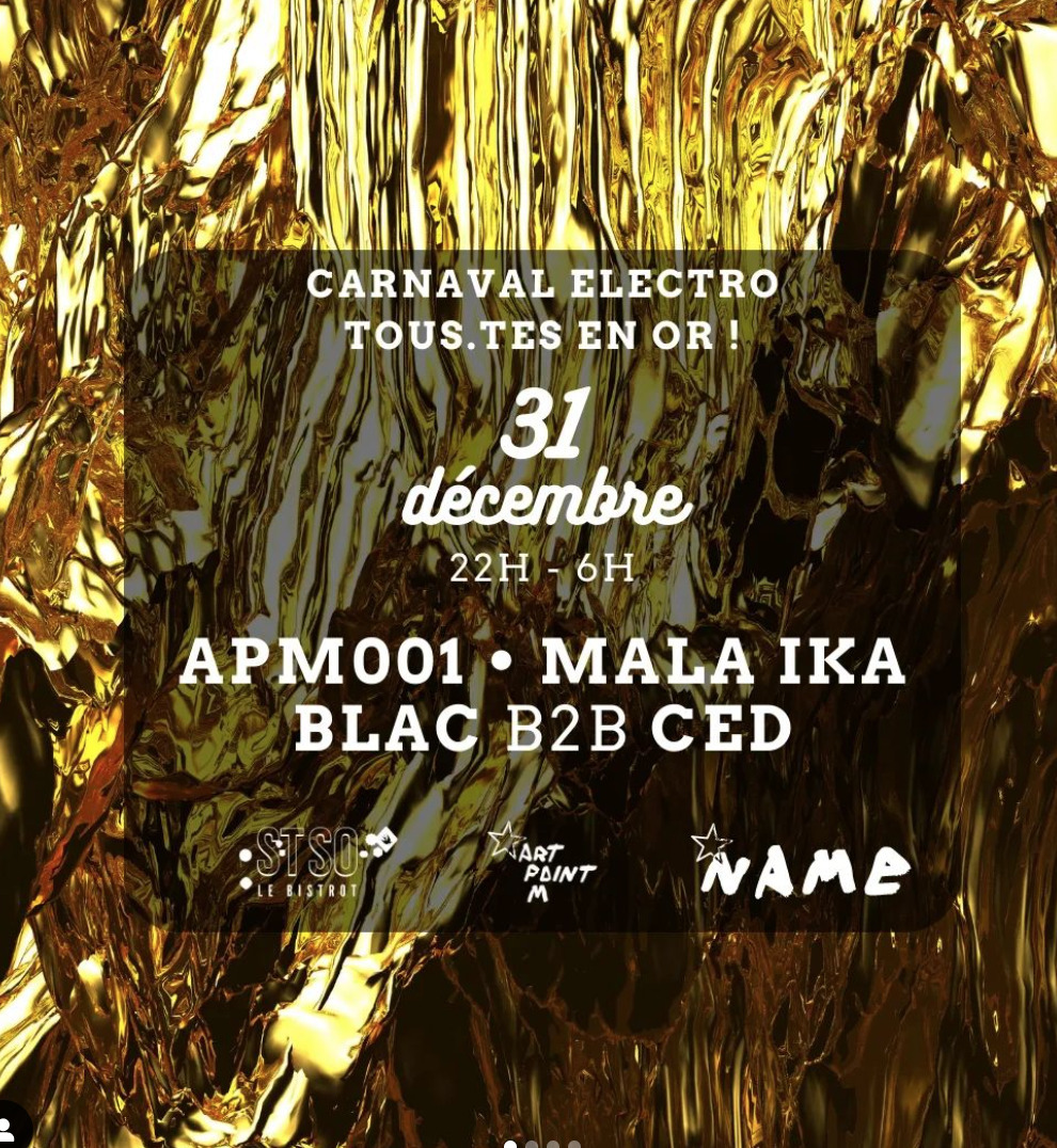• APM001 • ► Après un passage tonitruant aux Eurockéennes de Belfort cet été, le trio fondateur du NAME festival, imagine un carnaval électro – dress code « doré » – pour fêter la nouvelle année au Bistrot de St So ! À la techno profonde, mélodique et résolument dancefloor de Sébastien et Thierry, Fanny associe des images choc, intrigantes, engagées, parfois drôles et toujours magnétiques. ♫ https://soundcloud.com/apm001 ♫ https://open.spotify.com/artist/5BYf7zOiFEUV2GovlJQCej ◙ https://www.instagram.com/apm.001/?hl=fr