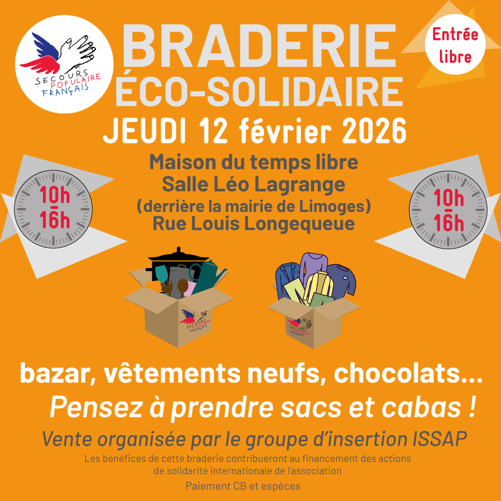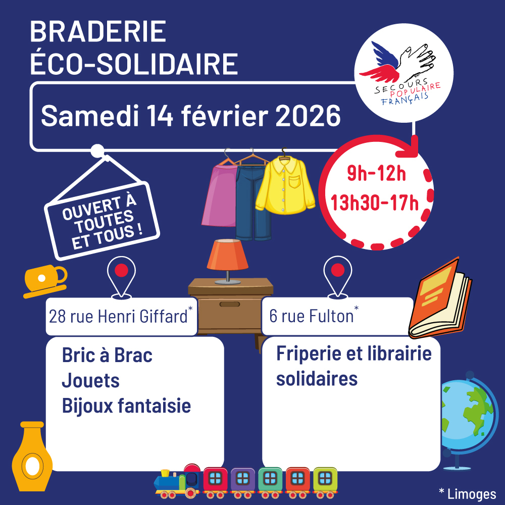 Les espaces de vente du Secours Populaire en Zone Nord à Limoges seront ouverts le samedi 21 mars 2026 de 9h00 à 12h00 et de 13h30 à 17h00.