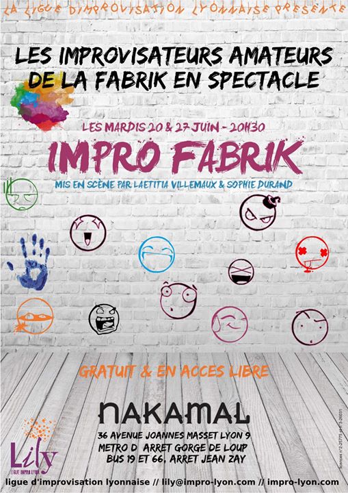 Les ateliers FABRIK de la Ligue d'Improvisation Lyonnaise se produiront les mardi 20 et mardi 27 juin prochains au Nakamal (Lyon 9 // Métro Gorge de Loup) pour leur présentation de fin de trimestre !