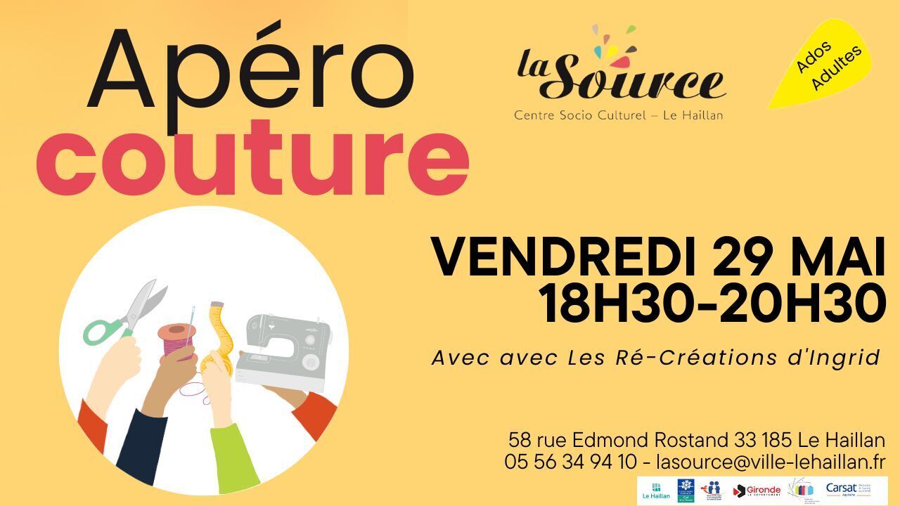 7€/ atelier + adhésion annuelle à La Source https://www.helloasso.com/associations/centre-socio-culturel-la-source/evenements/apero-couture-mai