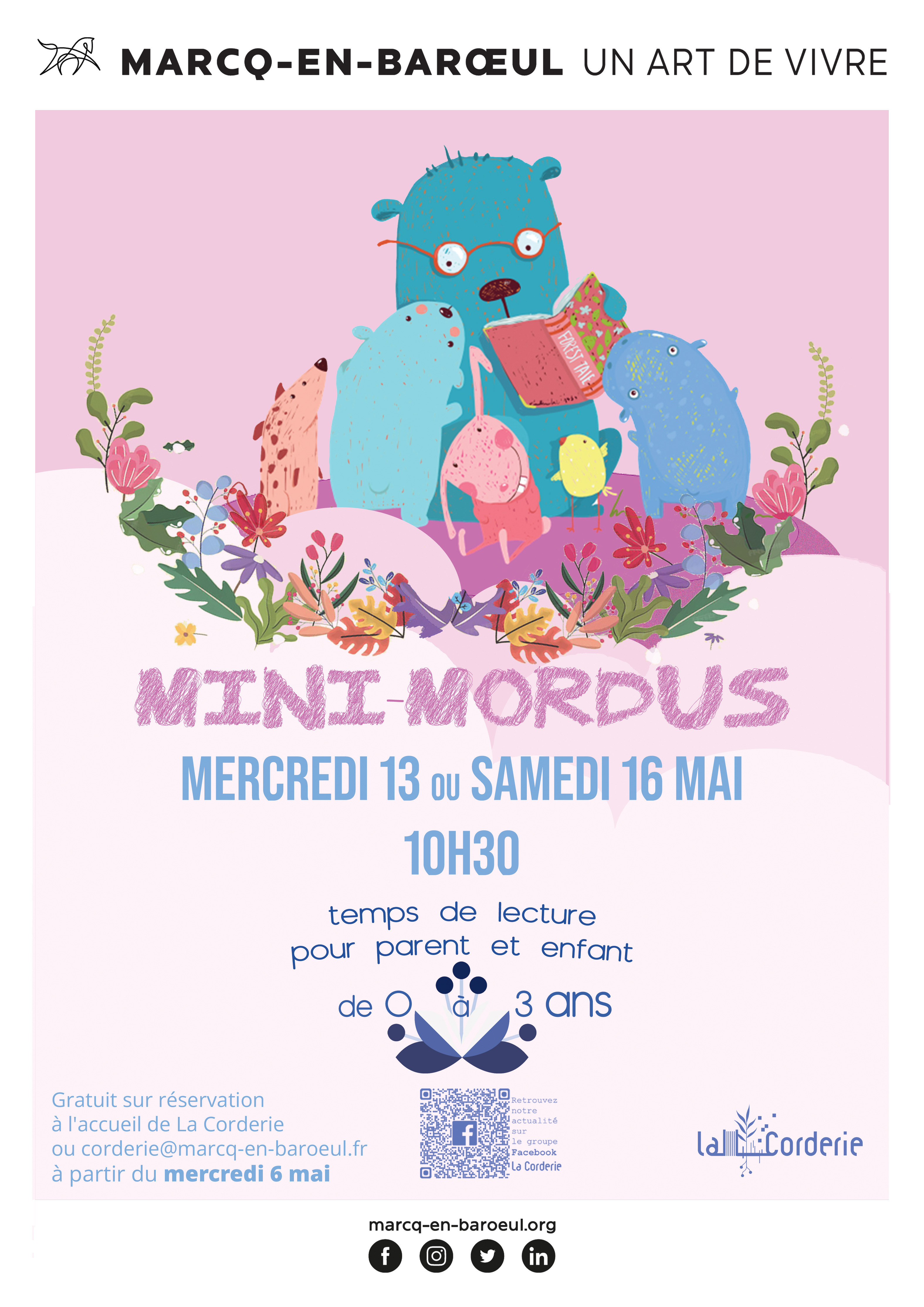 L'équipe de la Corderie invite les enfants de 0 à 3 ans, accompagnés d’un parent, à venir partager un temps de lecture et de découverte autour des livres. Comptines, histoires, jeux de doigts et albums tout en couleurs seront au rendez-vous pour éveiller les sens et le plaisir d’écouter.