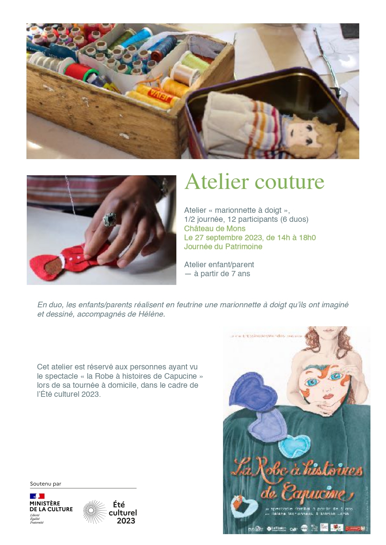 Ce spectacle est acceuillit par les amis de l'association 3,2,1 Patchez ! de Marsac-en-Livradois. De 14h à 18h, un atelier couture "Marionnettes à doigt" est proposé sur place, aux invités des différents hôtes du territoire Livradois-Forez qui ont acceuilli le specacle pendant l'Été culturel 2023. Il est animé par Hélène Marionneau.