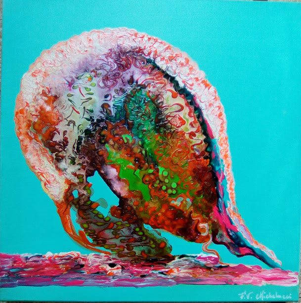 Des fonds sous-marins imaginaires et envoûtants jusqu’aux explosions solaires, la peinture hypnotique de Fabienne-Valérie Michelucci nous plonge dans une vision organique et cathartique de nous-mêmes et