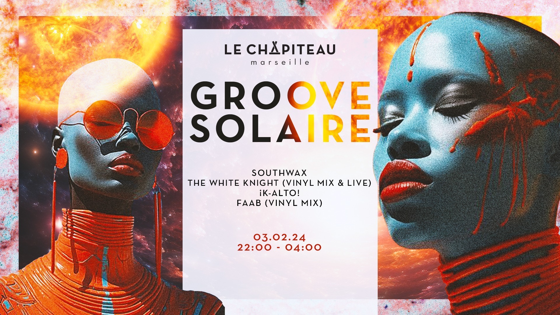 Ils vont vous sortir leurs meilleures pépites musicales, du Groove à la Techno en passant par la musique de l'espace intersidéral, pour que vous vous sentiez comme des astronautes en mission de danse intergalactique ! On vous promet une ambiance de feu et une sélection musicale qui vous en mettra plein les yeux Southwax est un collectif de DJs , producteurs, graphistes , musiciens créé en 2018. Le groupe Franco-Britannique réuni des collectionneurs de vinyles, wizards des platines, producteurs de leur propre morceau, qui mixent les genres de disco à techno. Southwax c’est aussi un label indépendant avec déjà 3 vinyles à son compteur. 🧑🚀 THE WHITE KNIGHT (VINYL MIX) + (LIVE) https://www.mixcloud.com/.../southwax-session-may-2023.../ Wizard des platines, collectionneur de vinyles, fan de Justice, producteur de morceaux électroniques sur son label Southwax, le White Knight mixe des sons pop, wave, punk, disco, techno et acid. 🧑🚀 ¡K-ALTO! https://www.mixcloud.com/.../southwax-sessions-k-alto.../ Dj Londonien aux platines depuis 30 ans . Il joue un mélange unique de disco à techno avec ses édits faits maison de ses morceaux préférés en y ajoutant ses boîtes à rythmes, synthétiseurs et samplers. 🧑🚀 FAAB (VINYL MIX) DJ depuis 1995, FaaB a débuté sa carrière sous le signe de l'acid/techno dans les raves de la région lilloise. Il multiplie les projets sonores, avec Gambit au sein de KINOSOUND (ciné-concert), il forme THE UGLY VIP (funky breaks) avec Fish. Depuis 2010, il revient à ses premières amours au sein des collectifs Expedit et Amikal Sonic, toujours en recherche d'eclectisme avec pour ligne directrice l'acid, qu'il soit électro, rock ou jazz. ——— INFOS PRATIQUES ——- PRÉ-VENTE ABONNÉ SHOTGUN : 5e + frais de loc PRÉ-VENTE : 7e + frais de loc SUR PLACE : 10e 💛 On prend soin les un·es des autres 💛 ➡ La musique s'arrête à 03h30 et on évite le bruit en quittant les lieux pour ne pas déranger les voisin·es : on vous attend donc on fire dès la première heure ! ➡ Tout comportement oppressif (agression, harcèlement, paroles et gestes déplacés…), qu’il soit à caractère sexiste, raciste, homophobe, transphobe, grossophobe, validiste (...) est banni du Chapiteau. Le Chapiteau se réserve le droit de refuser toute personne ayant des comportements oppressifs et/ou discriminatoires. ➡ L'équipe se tient à votre disposition si vous subissez quelconque type d'agression / harcèlement ou vous sentez mal à l'aise vis-à-vis du comportement d'un·e personne présente sur nos lieux. Si cela arrive, n'hésitez pas à vous adresser à notre chargée de prévention à l'accueil ou à contacter notre safe hotline : +33 7 51 17 93 32. ☮ PEACE LOVE and MUSIC !! Dans le respect, dans la joie, dans la musique !!