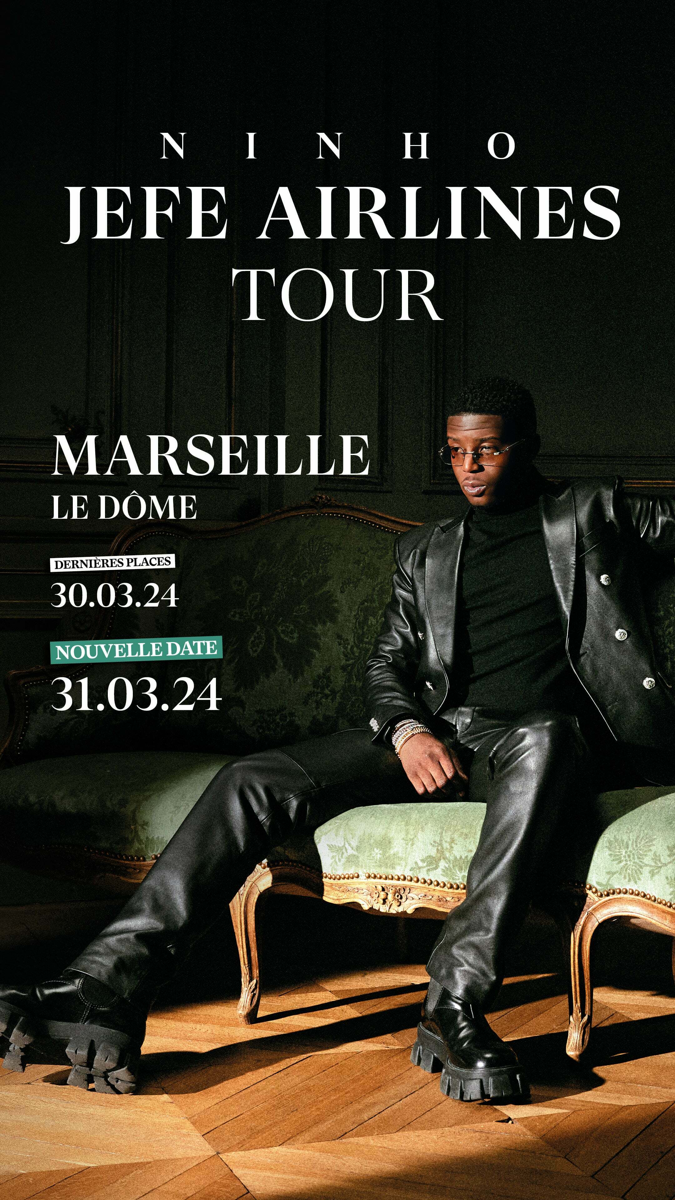 Face au succès de la date du Samedi 30 Mars 2024, Ninho annonce un second concert au Dôme de Marseille le Dimanche 31 Mars 2024 à 18h00 ! Billets disponibles dès maintenant. Retrouvez également l’artiste sur la scène du Festival de Nîmes le Samedi 6 Juillet 2024. Ninho, recordman du rap et premier artiste français à dépasser les 200 singles certifiés, est de retour avec le « JEFE AIRLINES TOUR » et un nouvel album événement ! En tournée dans toute la France en 2024. _____________________________________________________________ Retrouvez l'agenda musical complet de Marseille alive → https://www.marseillealive.fr/agenda-concerts/