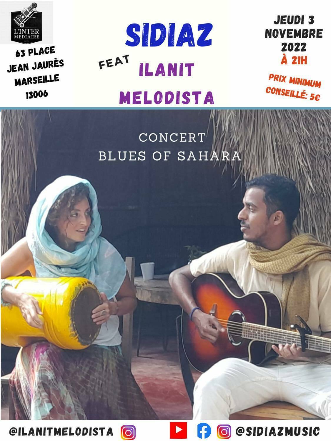 Concert sous forme d'invitation au voyage à l'inter avec Sidiaz feat Ilanit Melodista (blues sahara). Les deux artistes nous proposent une musique où se mélange ses influences entre Afrique et Méditerranée. https://www.facebook.com/watch/?v=244409344406603