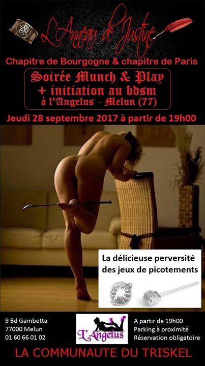 Sir John, la Communauté du Triskel/Anneau de Justine chapitre de Bourgogne et chapitre de Paris en partenariat avec le Club l'Angelus à Melun (77) sont heureux de vous proposer la 9ème soirée Munch & Play + Initiation BDSM le jeudi 28 septembre 2017 à partir de 19h00.
