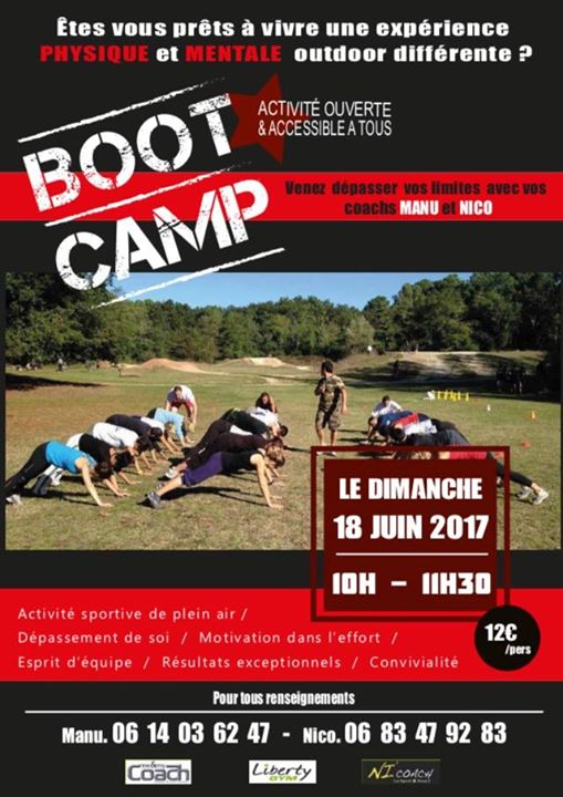 Evenement Boot Camp: activité sportive outdoor accessible à un grand publique (trés sportif, sportif, peu sportif). Il faut etre au moins capable de courir un peu et ne pas avoir de pathologies déclarées (cardiaque, gros problèmes de dos ou épaule etc...). Apres nous saurons nous adapter en terme d'intensité.