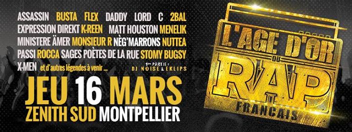 Après le succès du spectacle inédit L'Age d'Or du Rap Français au Casino de Paris, regroupant plus de 30 artistes, c'est toute l'histoire du rap des années 90 qui part en tournée. Conçu par Mazava Corp, L'Âge d'Or du Rap Français est un spectacle exceptionnel, qui retrace en musique, avec les artistes et auteurs de tous les classiques des années 90 à 2000, les temps forts de cette décennie.